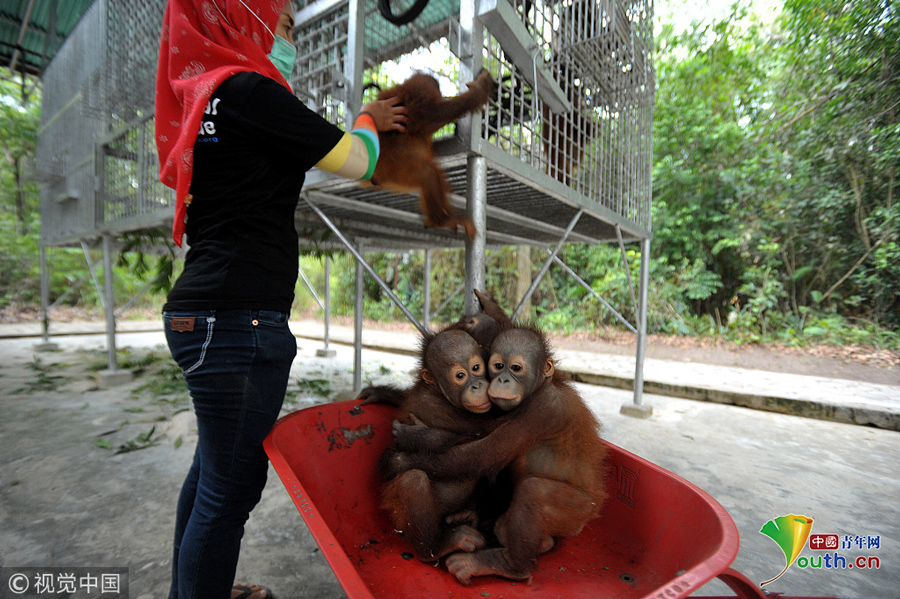 印尼動(dòng)物救援中心里 猩猩寶寶擠“校車”“上學(xué)”超萌
