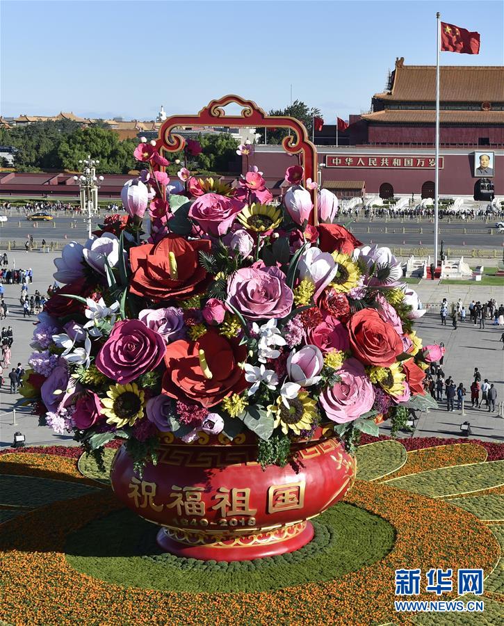 當(dāng)日,“祝福祖國”巨型花籃在北京天安門廣場全面亮相。據(jù)了解,從2011年開始,“祝福祖國”巨型花籃一直作為天安門廣場中心花壇的主景在國慶節(jié)期間向祖國獻禮。今年花籃內(nèi)布置有紅掌、梅花、康乃馨、向日葵、蘭花、月季等多種仿真花卉,寓意幸福吉祥。 新華社記者 李賀 攝
