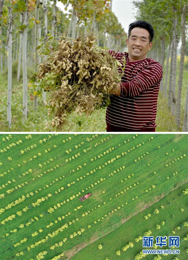 這張拼版照片顯示的是:上圖,9月18日,河北邢臺經(jīng)濟(jì)開發(fā)區(qū)郭龍莊村農(nóng)民王路坤展示收獲的花生;下圖,9月18日,王路坤駕駛農(nóng)機(jī)收獲花生(無人機(jī)拍攝)。 新華社記者牟宇攝