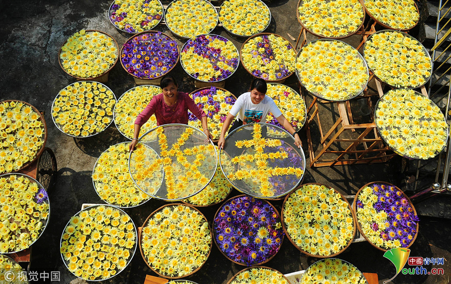 2018年9月23日,廣西柳州,柳北區(qū)石碑坪鎮(zhèn)下陶村的農(nóng)民覃向鮮和鄰居一起用已經(jīng)晾曬干了的九品香蓮擺出“豐收“字樣。圖片作者:陳健明