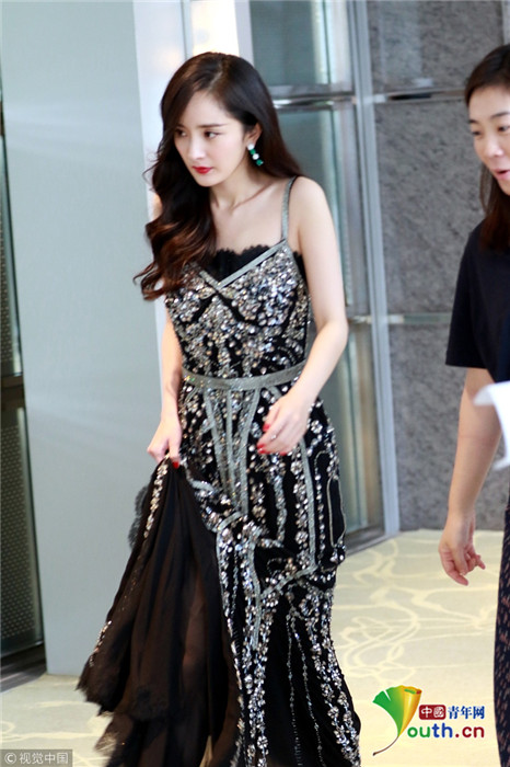 楊冪卷發(fā)成熟美露香肩 自提裙擺過酒店大堂