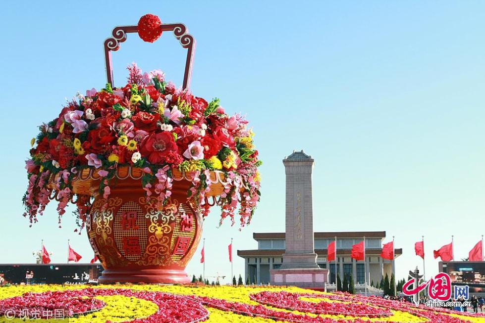 2012年天安門廣場中心花壇以“祝福祖國”為主題,以喜慶的花籃為主景?;▔睆?0米、頂高15米,以紅黃兩色為主打,花籃外圍,環(huán)繞著花草組成的祥云圖案。同時,主花壇設有燈光效果,即便是夜間游賞,也能清晰地看到“花容”。祝福祖國“花籃”凈高13米,籃盤直徑11米,真假花結(jié)合,選取牡丹、桃花、紫藤、百合等18個品種的花卉,最大花卉直徑2米。“花籃”通體中國紅,體現(xiàn)喜慶、祝福之意,配有金色紋絡,莊重、華貴?;@體鑲嵌三組“祝?!?、“祖國”字樣的燈箱?!盎ɑ@”底面是一品紅和小菊組成的如意圖案。