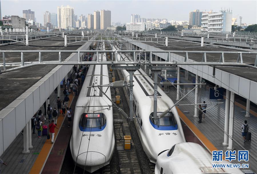 在廣西南寧站,旅客進(jìn)入站臺準(zhǔn)備乘坐動車出行(9月4日攝)。 廣西壯族自治區(qū)成立60年來,鐵路建設(shè)發(fā)生翻天覆地的變化。來自中國鐵路南寧局集團有限公司的數(shù)據(jù)顯示,1958年廣西鐵路總里程為1346.3公里,如今廣西鐵路總里程達(dá)5191公里。廣西與周邊相鄰省份間實現(xiàn)動車“公交化”開行。此外,北部灣港—重慶班列、東盟海產(chǎn)品冷鏈班列、“百色一號”果蔬專列等的開通和運營,強化了鐵路供給的針對性和有效性。鐵路成為助推廣西經(jīng)濟社會快速發(fā)展的“大動脈”。 新華社記者陸波岸攝