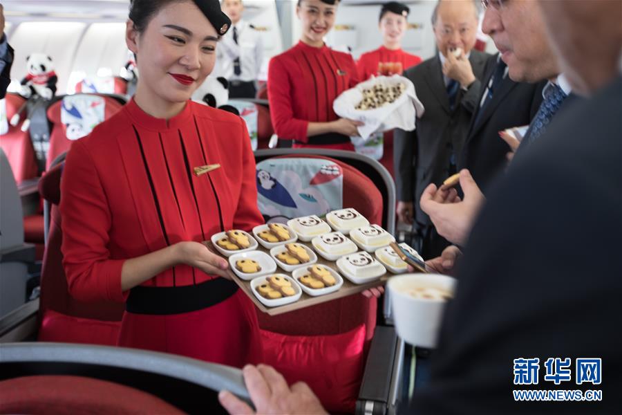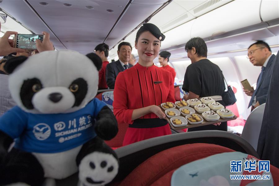 9月26日,在以色列特拉維夫本·古里安國際機(jī)場(chǎng),四川航空公司空乘人員在機(jī)上展示熊貓主題的小吃。  新華社記者郭昱攝