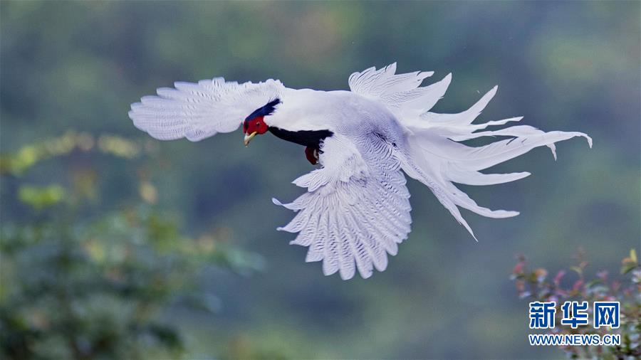 9月26日,一只白鷴在南靖縣鵝仙洞自然保護區(qū)飛翔。 新華社記者 梅永存 攝
