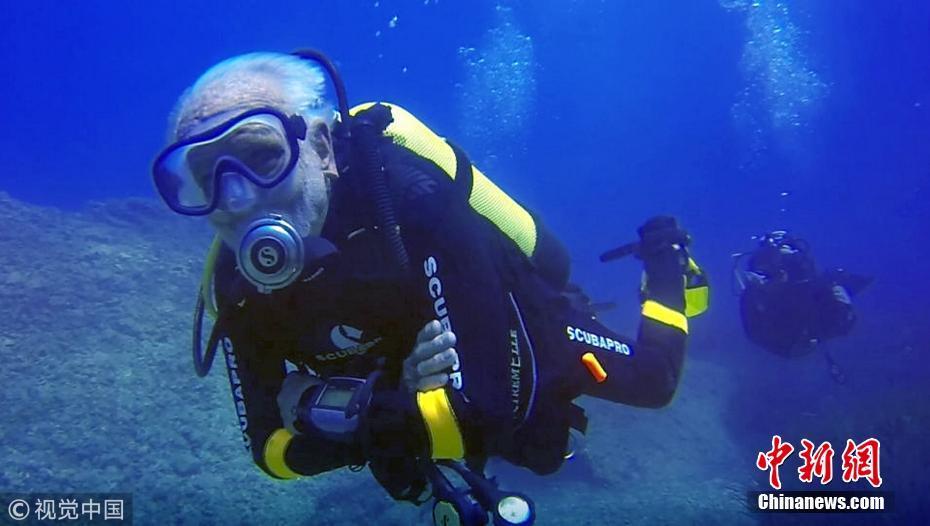 當(dāng)?shù)貢r間2018年9月1日,塞浦路斯,95歲的英國潛水員雷·伍利(Ray Woolley)以44分鐘下潛40.5米的成績打破了自己94歲達成的記錄(41分鐘下潛38.1米),二度刷新了世界上年齡最大的男性潛水員最好成績。在此次下潛中,這位二戰(zhàn)退伍老兵對距塞浦路斯南部城鎮(zhèn)拉納卡約2公里處的海域進行了探索,1980年一艘名為“芝諾比亞號”(Zenobia)的貨船在這里進行首次航行時沉沒。圖片來源:視覺中國