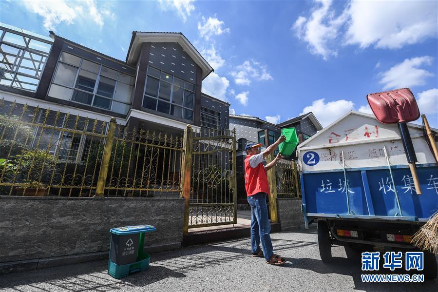 9月27日,小浦鎮(zhèn)合溪村垃圾分類清運(yùn)員符正芳在清運(yùn)村民門口的分類垃圾桶,同時他還要用手機(jī)上的垃圾分類APP進(jìn)行掃碼簽到,確保每天每戶清掃到位。從9月初開始,浙江省長興縣小浦鎮(zhèn)推廣使用手機(jī)垃圾分類智能管理平臺。通過這款A(yù)PP可以進(jìn)行村民垃圾分類情況打分、清運(yùn)員每日簽到、監(jiān)督員巡查等,并能即時生成農(nóng)戶垃圾分類“成績單”,所有農(nóng)戶均可通過APP查詢垃圾分類排行榜,既方便又環(huán)保。新華社記者 徐昱 攝