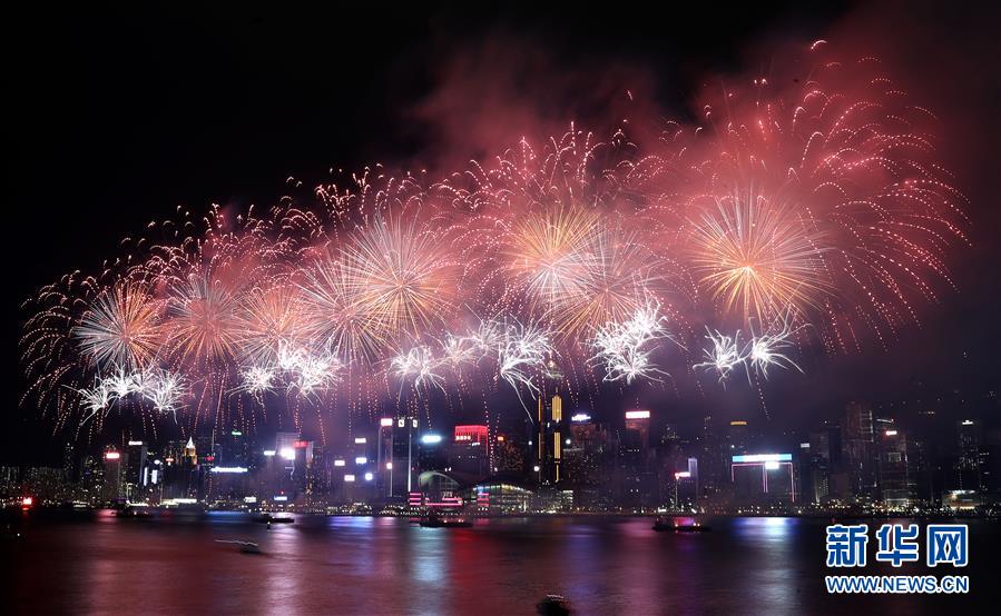 這是10月1日晚拍攝的香港維多利亞港煙花匯演。當(dāng)晚,香港維多利亞港舉行煙花匯演,慶祝中華人民共和國成立69周年。新華社記者李鋼攝