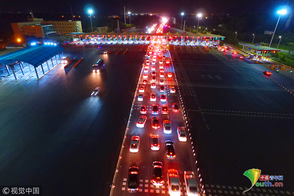 2018年10月1日,國(guó)慶假期首日凌晨1點(diǎn)左右,南京迎來(lái)出行高峰,所有高速公路出城方向迎來(lái)大批車輛,航拍南京長(zhǎng)江二橋收費(fèi)站,大量車輛排起長(zhǎng)龍,場(chǎng)面尤為壯觀。圖片作者:方東旭