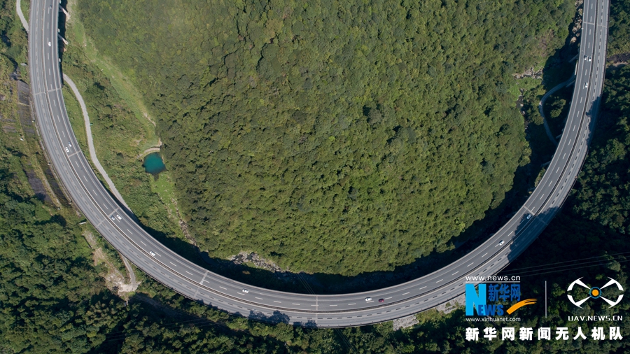 這是廈蓉高速長下坡龍巖路段的道路景觀,高速路走向形成罕見的半圓形。改擴(kuò)建工程竣工之后,長下坡將改成上行線,變?yōu)樯掀侣范危o人機(jī)拍攝)。新華網(wǎng) 肖和勇 攝
