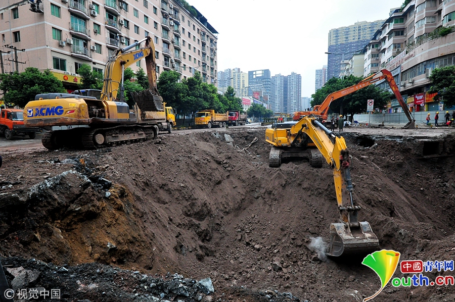 中國青年網(wǎng)北京10月9日電 2018年10月8日消息,四川達(dá)州。10月8日從四川省達(dá)州市達(dá)川區(qū)委宣傳部獲悉,7日14時30分左右,達(dá)川區(qū)東環(huán)南路103號人行道路面發(fā)生塌陷險情,經(jīng)調(diào)取視頻監(jiān)控和走訪周邊群眾,救援人員初步判斷疑似有4人掉入坑中。圖片作者:視覺中國