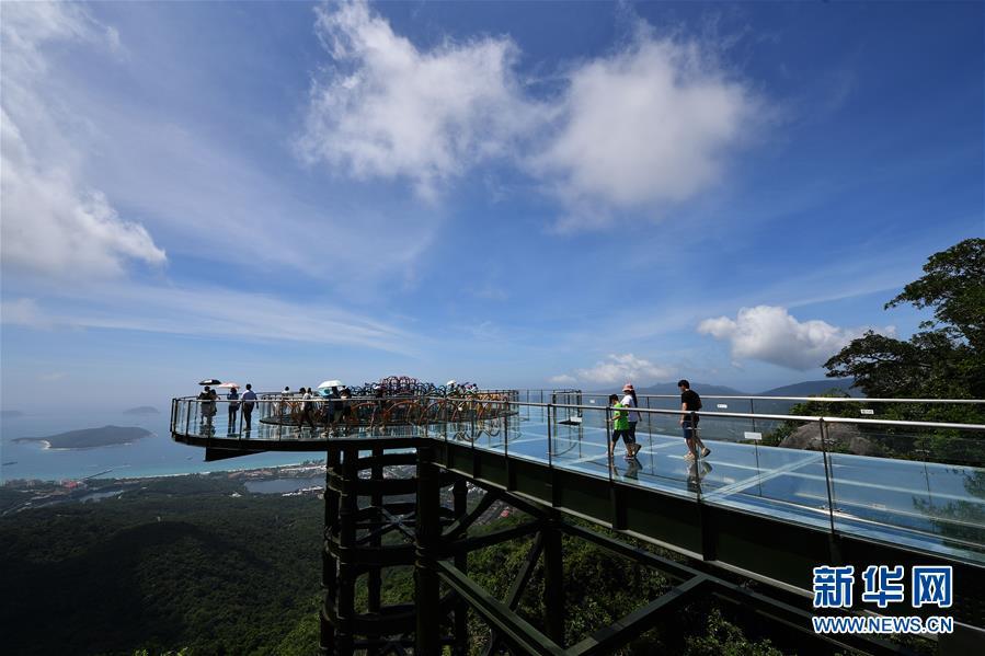 8月31日,游客在玻璃觀景平臺(tái)上參觀游覽。近日,位于海南省三亞市亞龍灣熱帶天堂森林公園的大佛石全海景玻璃棧道開始正式營業(yè)。凌空而建的玻璃棧道全長400米,游客可將亞龍灣的美景盡收眼底。新華社記者郭程攝