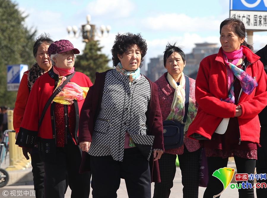 中國青年網(wǎng)北京10月10日電 2018年10月9日,北京,游客紛紛著秋冬裝游覽天安門廣場。當天北京冷空氣來襲。圖片來源:視覺中國