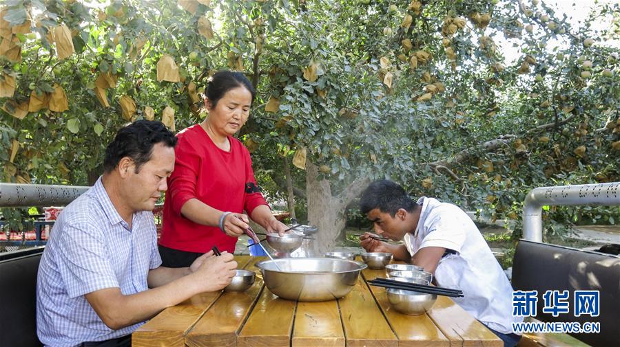 甘永軍(左一)在地處新疆阿克蘇地區(qū)柯柯牙綠化工程內(nèi)的果園吃飯(2017年9月22日攝)。10年前,甘永軍還在果園開(kāi)起了第一個(gè)農(nóng)家樂(lè),帶動(dòng)周邊100多戶(hù)果農(nóng)經(jīng)營(yíng)起了自家庭院。 在世界第二大流動(dòng)性沙漠——塔克拉瑪干沙漠西北邊,一條逾百萬(wàn)畝的人工林帶傲然挺立。 這條林帶就是柯柯牙荒漠綠化工程。它是新疆阿克蘇黃沙漫漫和碧波萬(wàn)頃的分界嶺。 1986年,為改變惡劣的自然條件,阿克蘇啟動(dòng)柯柯牙綠化工程。30年間,各族干部群眾攜手奮斗,曾是沙塵暴策源地的柯柯牙綠樹(shù)成蔭;并以此為原點(diǎn),在南疆戈壁荒灘上孕育出百萬(wàn)畝的“綠?!?。 30多年來(lái),阿克蘇打造出“人走政不息”的樣本,使綠色發(fā)展理念成為幾代人的廣泛共識(shí);“自力更生、艱苦奮斗、無(wú)私奉獻(xiàn)”的柯柯牙精神,已融入各族兒女血液中;“以林養(yǎng)林”“邊綠化邊脫貧”的綠化、脫貧方式,給其他荒漠地區(qū)貢獻(xiàn)了“柯柯牙智慧”。 新華社記者 杜剛 攝