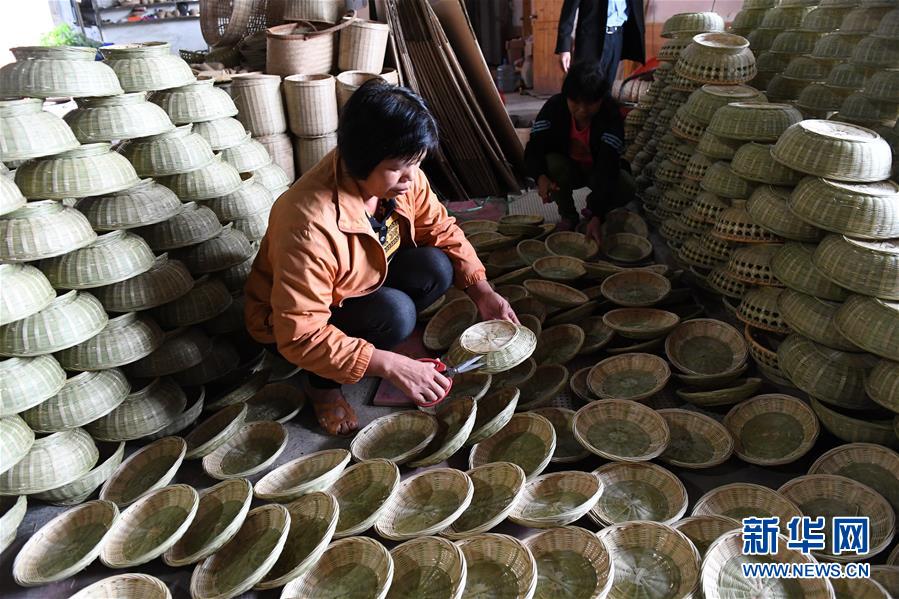 10月11日,在廣西靈山縣平南鎮(zhèn)硤木村一家竹編企業(yè),員工在加工竹編產(chǎn)品。