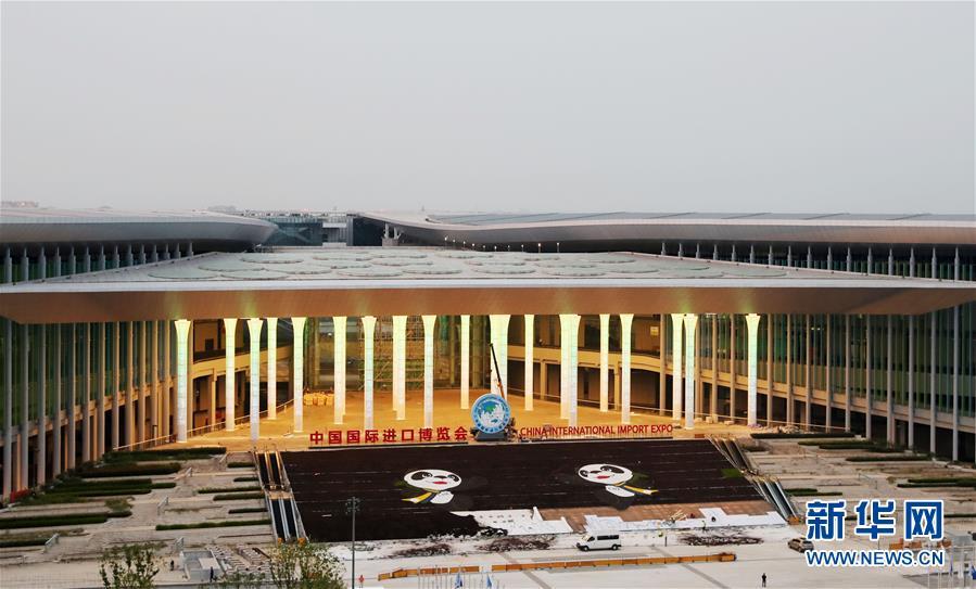 2018年9月30日,中國國際進(jìn)口博覽會(huì)舉辦地國家會(huì)展中心(上海)南廣場燈光柱亮起,吉祥物“進(jìn)寶”的圖案也裝飾到位。