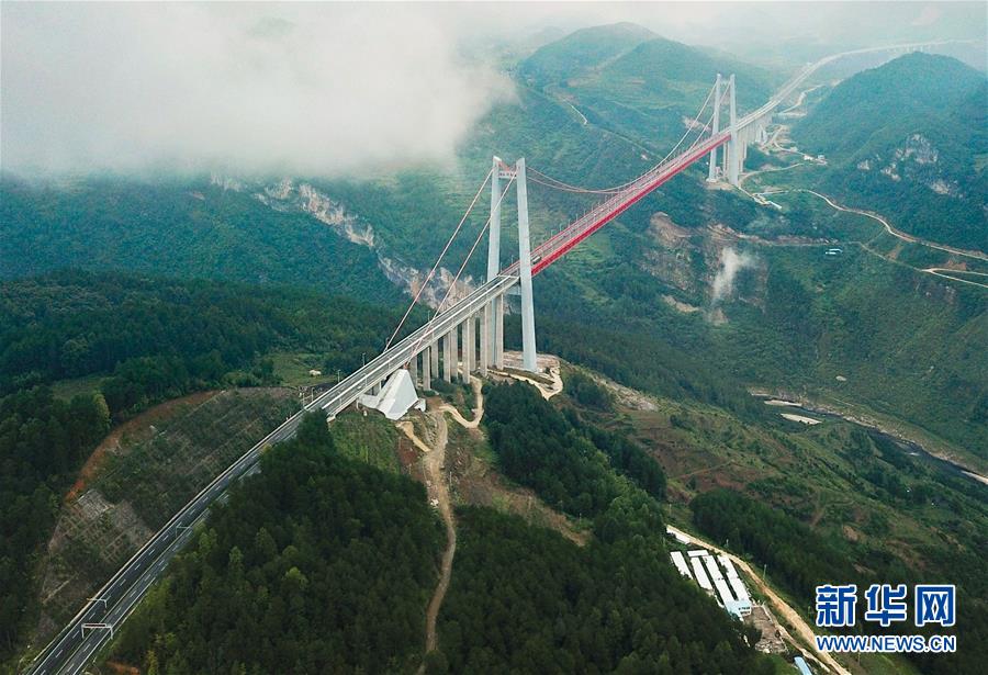 貴陽至甕安高速公路上的清水河大橋(8月27日無人機(jī)拍攝)。該橋主跨1130米,是世界上最大單跨板桁結(jié)合加勁梁懸索橋。新華社記者劉續(xù)攝