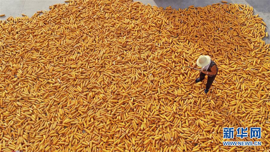 10月14日,河北省南和縣閆里鄉(xiāng)閆里村農(nóng)民在晾曬收獲的玉米(無(wú)人機(jī)拍攝)。