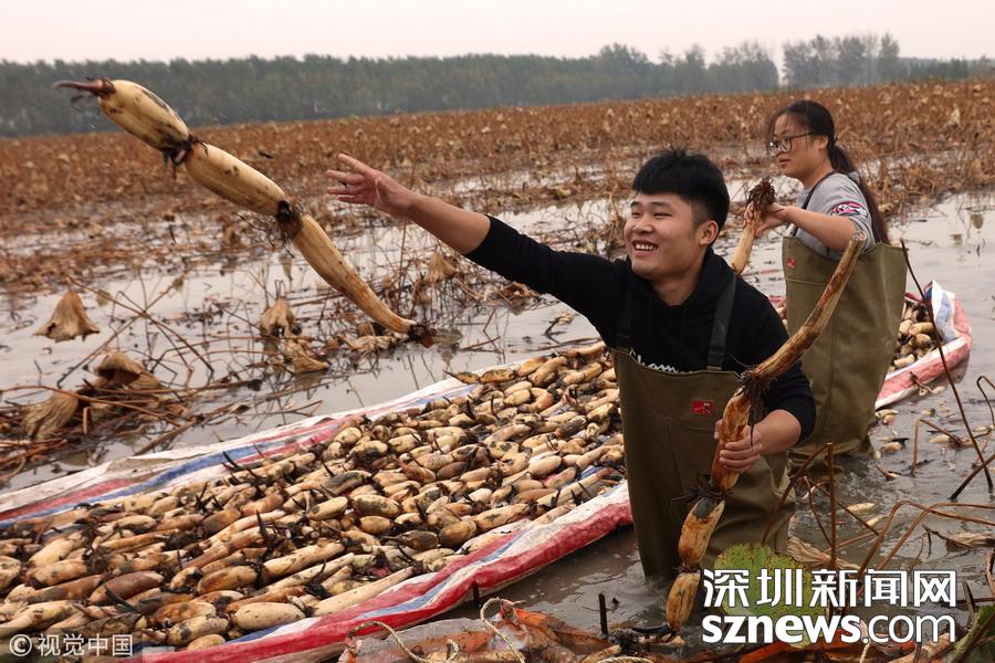 深圳新聞網(wǎng)訊   2018年10月14日,在江蘇宿遷泗洪縣曹廟鄉(xiāng)瓦廟村藕蝦共作基地,一場以藕為主題的慶祝豐收活動正在舉行。充滿農趣的挖蓮藕、選藕王、挑蓮藕、切藕片等比賽活動,吸引當?shù)剞r民積極踴躍參與,切身感受到了豐收帶來的喜悅。