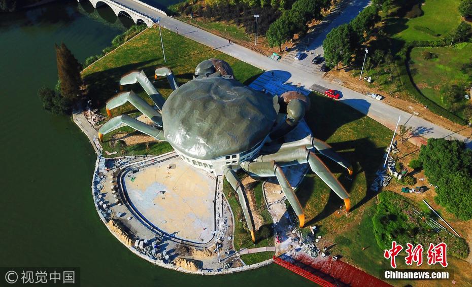 2017年10月31日,江蘇省昆山市巴城巴解園內(nèi)的東陽澄湖岸邊,一只青背白肚金爪黃毛,長75米,高約16米的蘇州陽澄湖“超級大閘蟹”栩栩如生。圖片來源:視覺中國