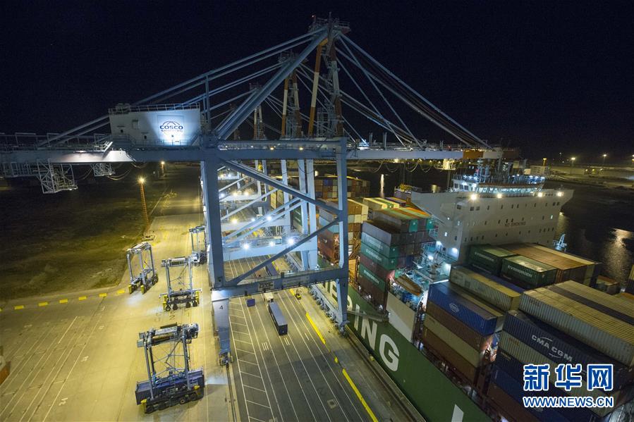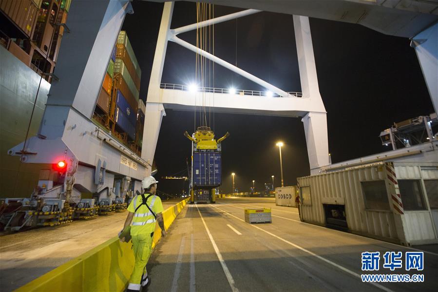 10月15日晚,中遠海運旗下的“中?;鹦恰碧柤b箱輪??吭诒壤麜r澤布呂赫港集裝箱碼頭。 新華社記者 葉平凡 攝