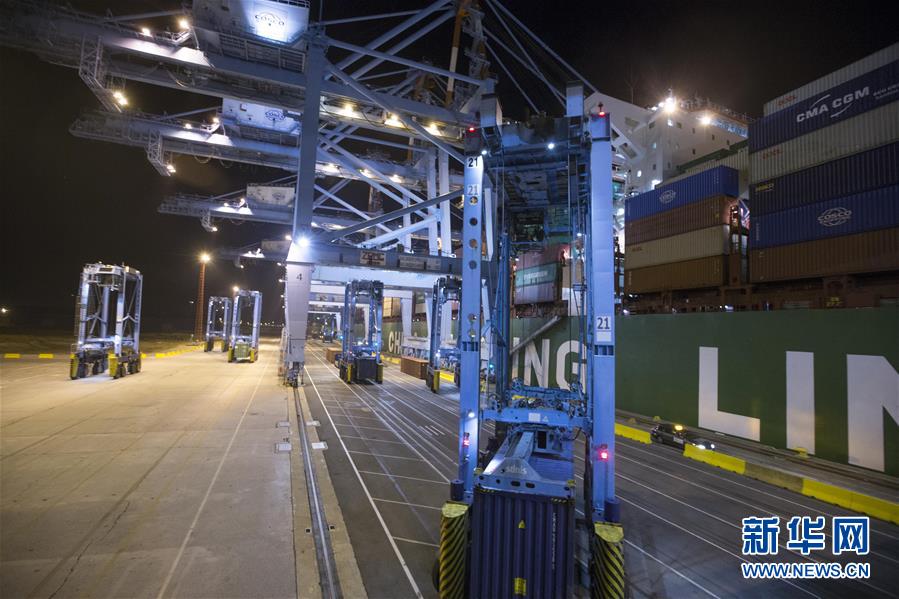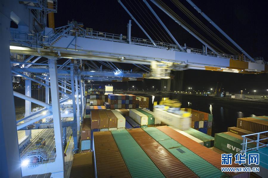 這是10月15日晚在比利時澤布呂赫港拍攝的正在進行裝卸作業(yè)的集裝箱碼頭。新華社記者 葉平凡 攝