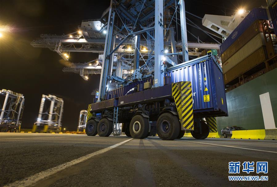 10月15日晚,在比利時澤布呂赫港集裝箱碼頭,跨運車運送集裝箱。 新華社記者 葉平凡 攝
