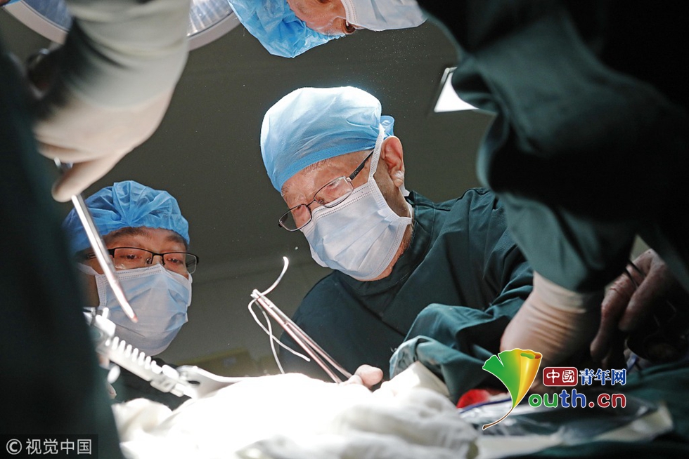 2018年4月13日,在江蘇省徐州市第一人民醫(yī)院手術(shù)室,96歲高齡的“中國肝膽外科之父”、中國科學(xué)院院士吳孟超親自為患者進(jìn)行手術(shù)。當(dāng)日,吳孟超院士和中國人民解放軍海軍軍醫(yī)大學(xué)附屬東方肝膽外科醫(yī)院的醫(yī)療團(tuán)隊(duì)來到江蘇徐州為患者進(jìn)行手術(shù)。 殷立勤/視覺中國