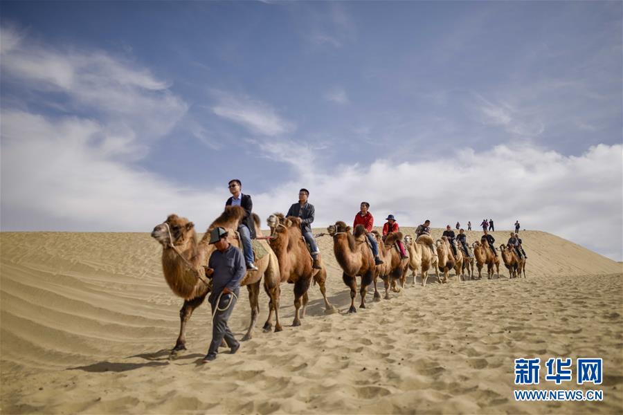 10月16日,游客在羅布人村寨里騎著駱駝游覽。