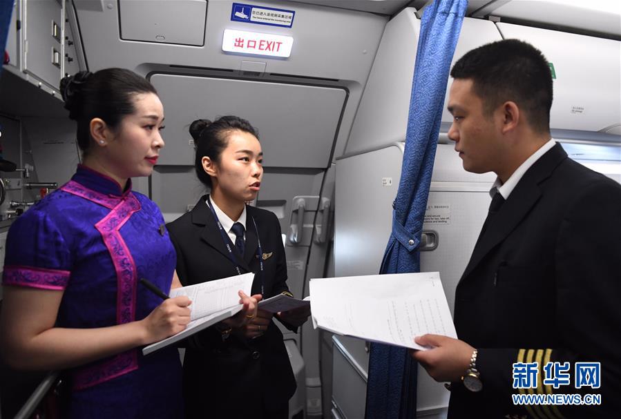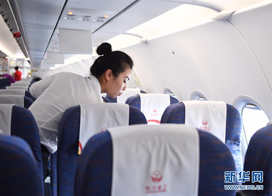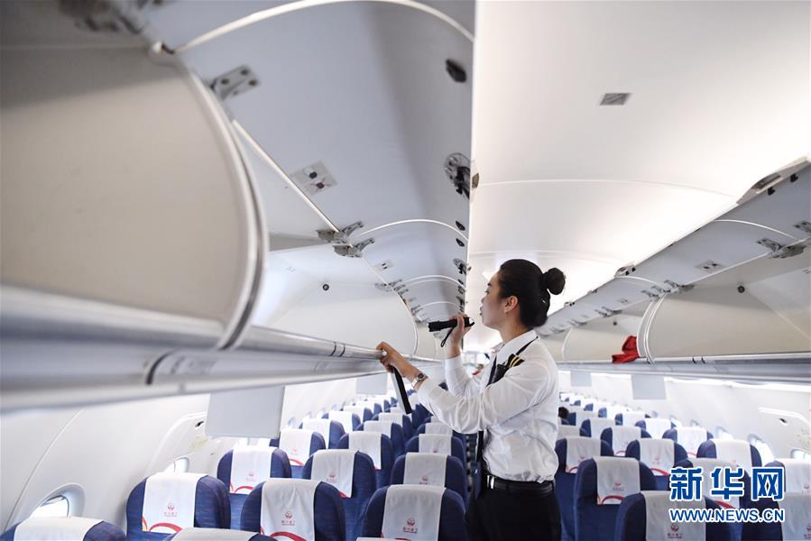 10月16日,湯春燕對飛機客艙進行安保檢查。 新華社記者王全超攝