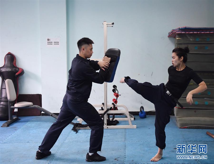 10月16日,湯春燕在健身房內(nèi)進行擒敵訓練。