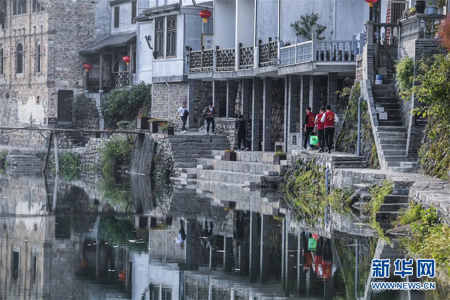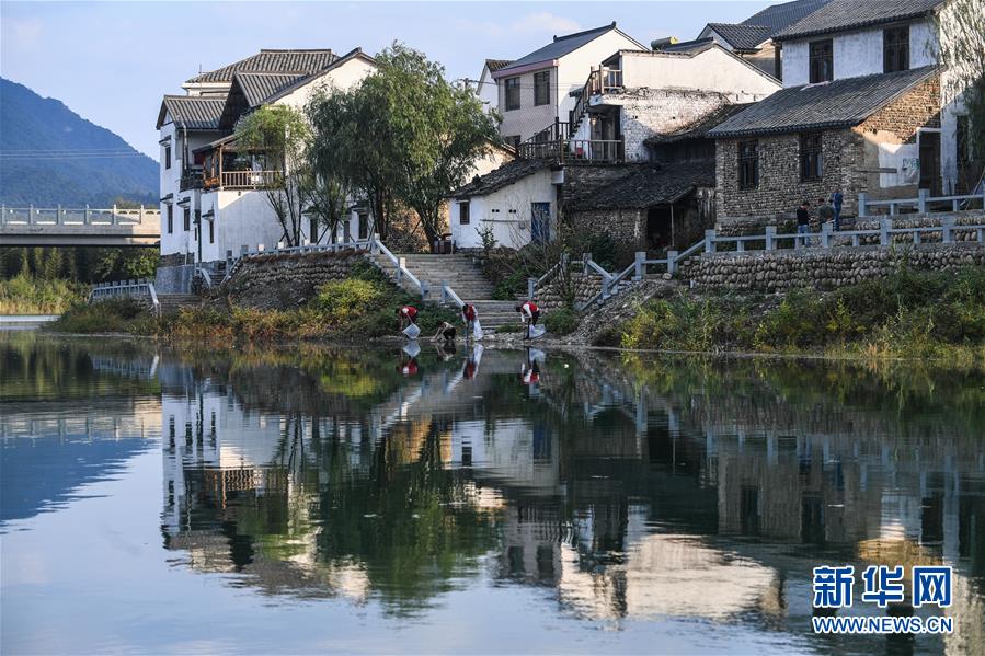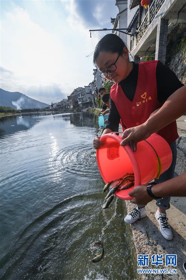 10月17日,河橋鎮(zhèn)的青年黨員們?cè)阪?zhèn)邊的昌南溪投放魚苗。新華社記者 徐昱 攝