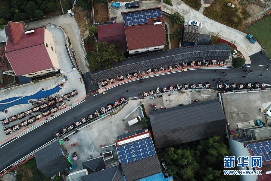 10月17日,村民與賓客在龍峰民族村參加“長桌宴”(無人機(jī)拍攝)。 當(dāng)日,在浙江省桐廬縣莪山畬族鄉(xiāng)龍峰民族村,一百桌宴席沿道路擺成一字長蛇陣,四方賓客和當(dāng)?shù)卮迕褚黄鹌穱L著具有畬族特色的菜肴,場面頗為壯觀。 新華社記者 黃宗治 攝