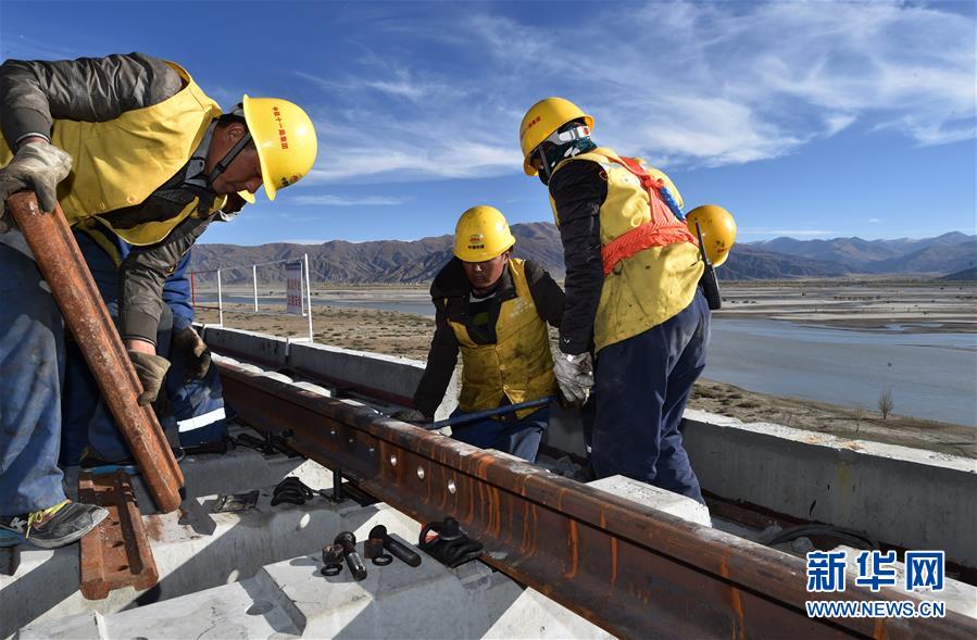 中鐵十一局的工人在川藏鐵路拉林段昌果特大橋進(jìn)行鋪軌作業(yè)(10月16日攝)。 近日,川藏鐵路拉薩至林芝段昌果特大橋開始鋪設(shè)行軌排、架設(shè)梁片,標(biāo)志著川藏鐵路拉林段正式進(jìn)入鋪軌階段。 新華社記者 覺果 攝