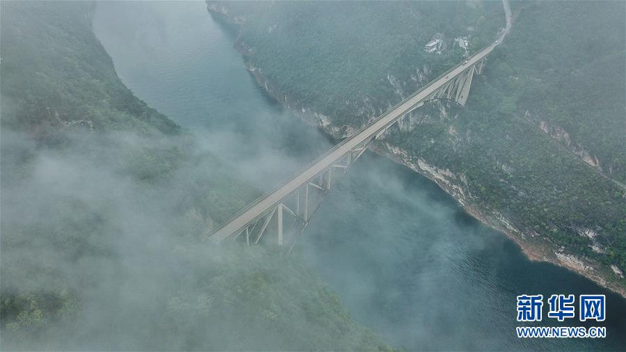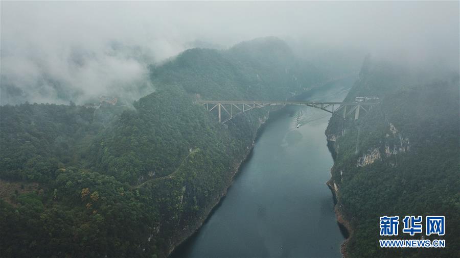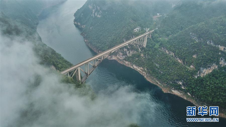 10月18日無人機航拍的江界河大橋。 當日,位于貴州甕安縣的江界河大橋云霧環(huán)繞,景美如畫。 新華社記者歐東衢攝