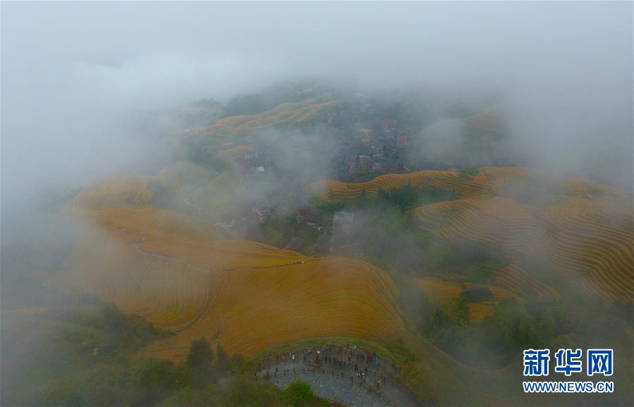 10月16日,游客在秋雨中欣賞龍脊梯田秋色(無人機拍攝)。金秋時節(jié),廣西龍勝各族自治縣龍脊梯田美如畫卷。 新華社記者 黃孝邦 攝