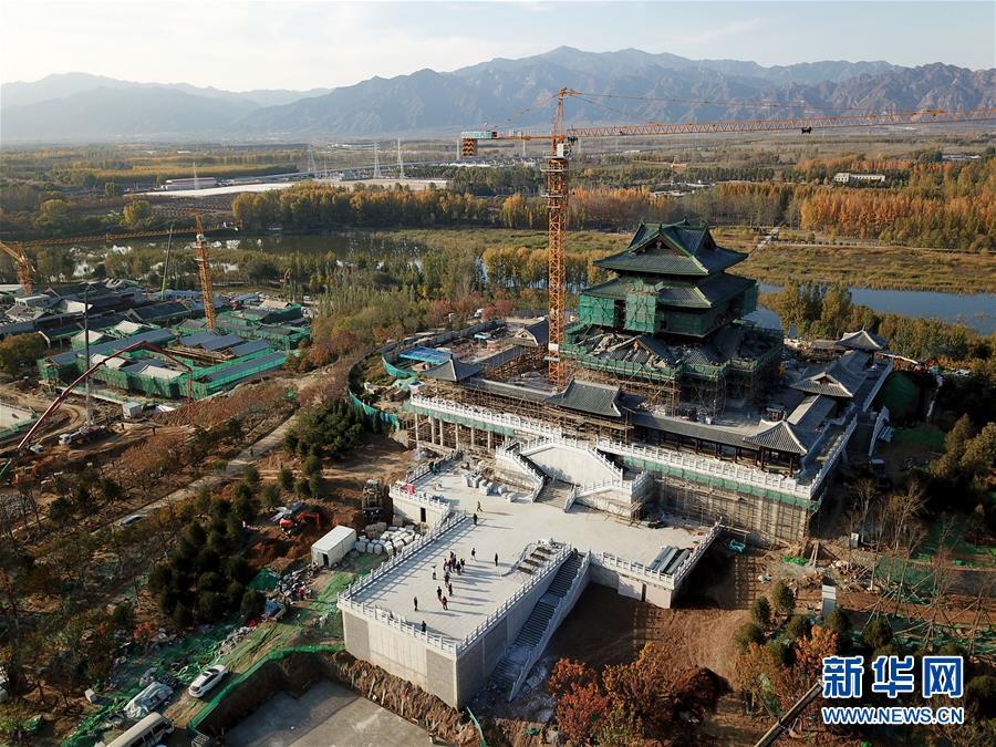 10月18日拍攝的建設(shè)中的北京世園會永寧閣(無人機拍攝)。 新華社記者 羅曉光 攝