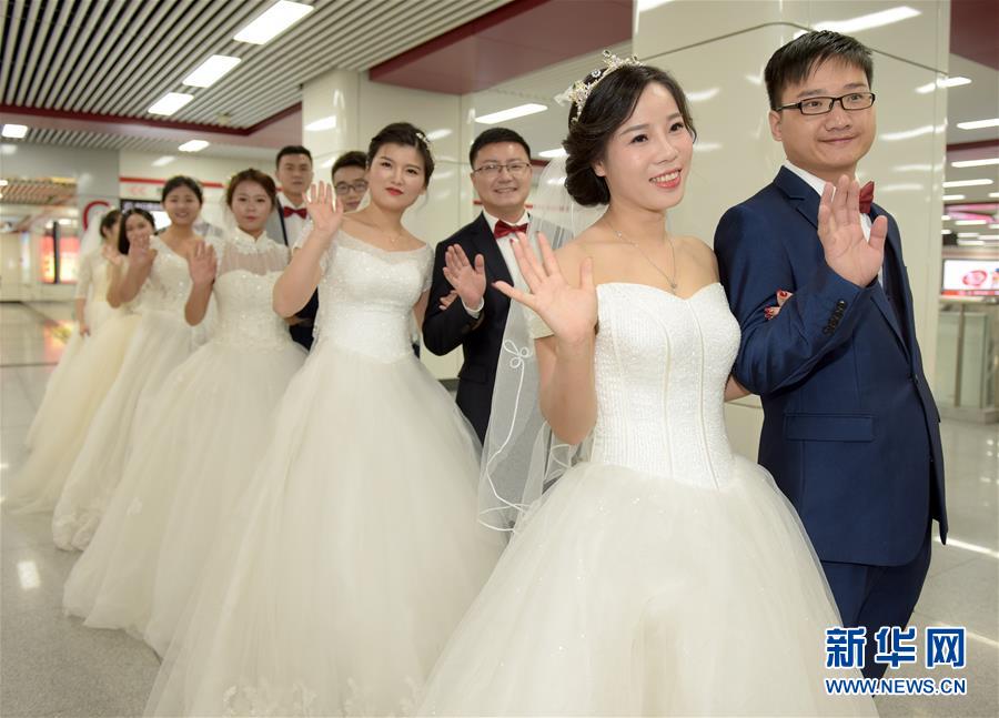 10月18日,在合肥市地鐵一號線,新人們準(zhǔn)備乘坐地鐵。當(dāng)日,中鐵四局集團(tuán)城市軌道交通工程分公司的18對新人在安徽合肥地鐵一號線的車廂里舉行了一場集體婚禮儀式。 新華社記者 郭晨 攝