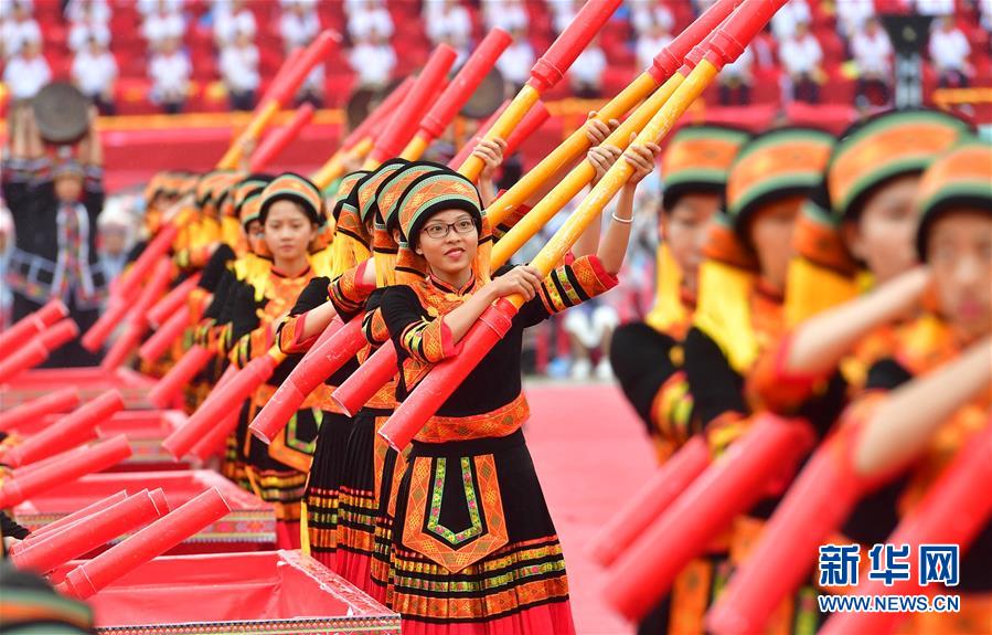 10月20日,各族同胞在廣西大化瑤族自治縣江濱文化廣場表演節(jié)目,慶??h慶。 新華社記者黃孝邦攝