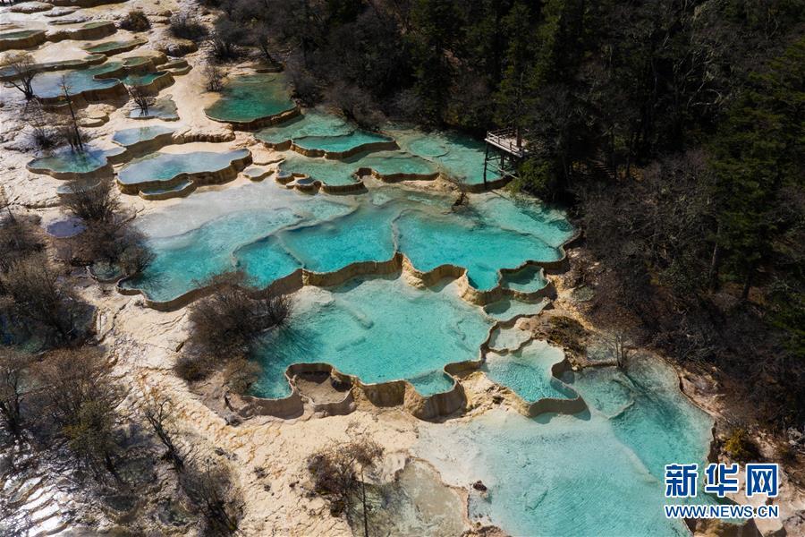 俯瞰黃龍溝爭艷池一角(10月19日無人拍機(jī)攝)。深秋時節(jié),在雪山、藍(lán)天、白云和彩林映襯下,黃龍溝中的彩池色彩更加斑斕,目前黃龍景區(qū)進(jìn)入觀賞最佳時節(jié)。黃龍風(fēng)景名勝區(qū)位于四川省松潘縣境內(nèi),以彩池、灘流、雪山、峽谷、森林等聞名,享有“人間瑤池”“圣地仙境”之美譽(yù)。新華社記者 江宏景攝