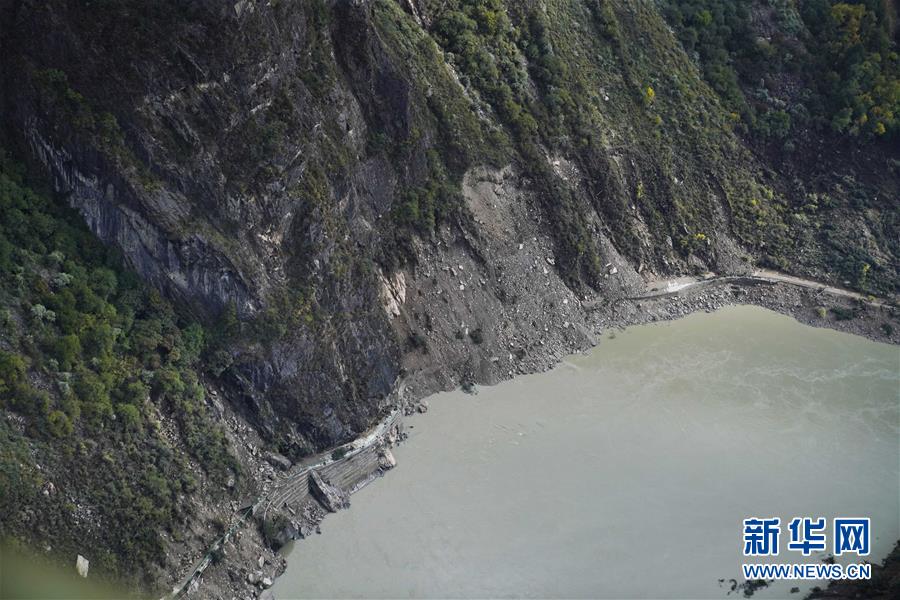 10月20日,西藏雅魯藏布江米林縣堰塞湖自然過流后,露出損毀的道路。 10月19日13時30分,西藏雅魯藏布江米林縣堰塞湖開始自然過流。記者從應(yīng)急管理部牽頭的聯(lián)合工作組獲悉,截至20日7時,雅魯藏布江堰塞湖壩前水位已下降56米,估算留存水量1.6億立方米,堰塞湖洪水威脅得到緩解,防洪安全風(fēng)險大大減輕,并將繼續(xù)降低。 10月20日,記者乘坐直升機(jī)從空中拍攝了雅魯藏布江堰塞湖自然過流的畫面。 新華社記者普布扎西攝
