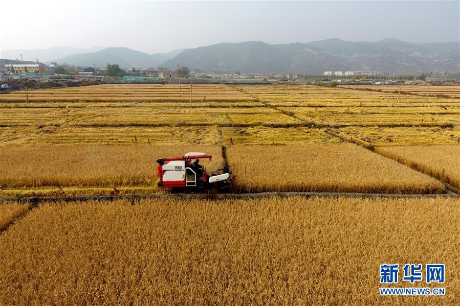 在太原市晉源區(qū)赤橋村,收割機在稻田里作業(yè)(10月17日無人機拍攝)。近日,山西省太原市晉源區(qū)2000多畝水稻迎來收割季。 金秋時節(jié),農(nóng)民們忙著收獲成熟的農(nóng)作物,喜迎豐收。 新華社記者 詹彥 攝