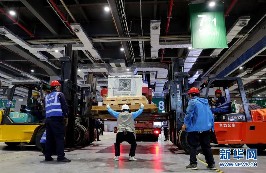 10月22日,現(xiàn)場(chǎng)工人動(dòng)用四臺(tái)叉車同時(shí)作業(yè),將“金牛座”龍門銑床核心部件溜板滑枕抬起后等待卡車就位裝車。 當(dāng)日,來(lái)自德國(guó)的首屆進(jìn)口博覽會(huì)最大展品——“金牛座”龍門銑床完成初步組裝,將運(yùn)往國(guó)家會(huì)展中心(上海)3號(hào)館進(jìn)行最后的安裝施工。這是德國(guó)瓦德里希科堡公司研發(fā)的機(jī)床設(shè)備,高約8米,占地面積約200平方米,將在智能及高端裝備區(qū)進(jìn)行展出。 新華社記者方喆攝