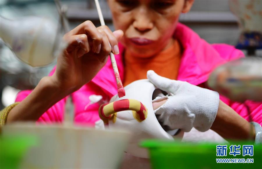 10月23日,德化順美陶瓷有限公司工人在生產(chǎn)線上給陶壺上色。  新華社記者魏培全攝
