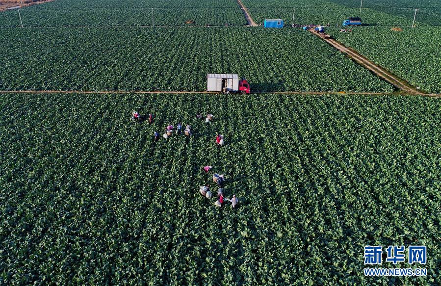10月29日,樂亭縣馬頭營鎮(zhèn)馬頭營村的農(nóng)民在收獲菜花(無人機(jī)拍攝)。 新華社記者楊世堯攝