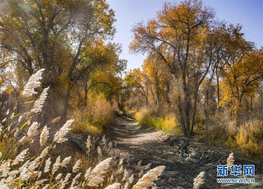 新疆輪臺縣胡楊林深處的一條小路(10月25日攝)。 10月中下旬,靜靜的塔里木河中下游一片金黃。胡楊深處,條條小路蜿蜒綿長通向遠(yuǎn)方,引人入勝。 塔里木河是中國最長的內(nèi)陸河,這一區(qū)域原始胡楊林分布較為集中。隨著塔里木河連續(xù)19次向下游生態(tài)輸水,為胡楊林“解渴”,塔河兩岸生態(tài)得到明顯改善,沙地面積逐年減少。 新華社記者趙戈攝