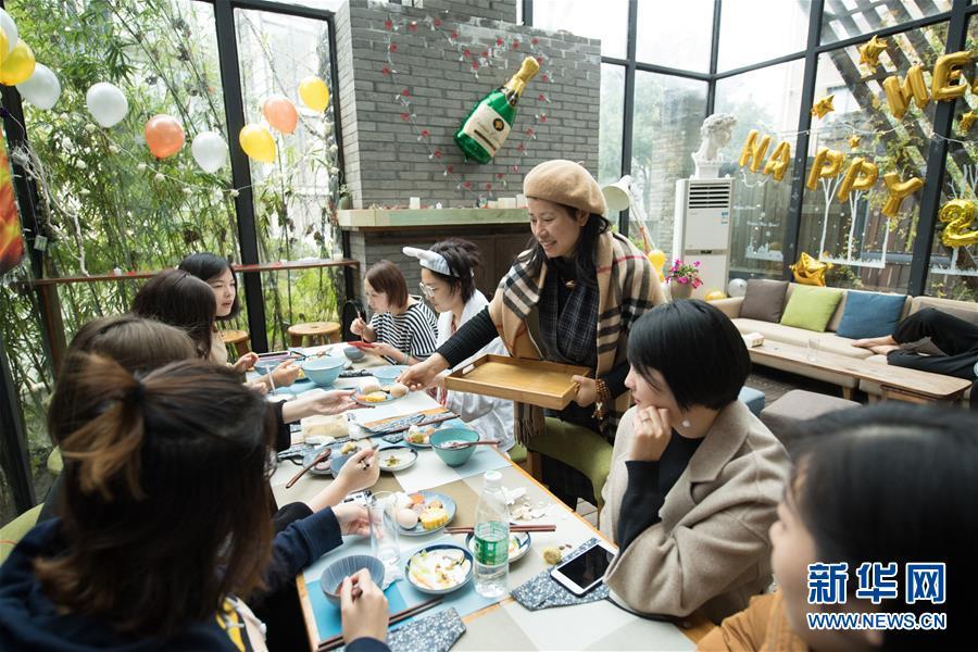在浙江省杭州市外桐塢村,民宿主人龐代君(右三)在她創(chuàng)立于2016年的“畫(huà)·鄉(xiāng)院”精品民宿為客人送早餐(2018年1月3日攝)。外桐塢村是西湖西面群山中的一個(gè)小村落,傳統(tǒng)以茶葉生產(chǎn)為主要經(jīng)濟(jì)來(lái)源,自2010年以來(lái)著力打造藝術(shù)村落,目前已擁有藝術(shù)家工作室43個(gè)、高檔民宿7家、美術(shù)館和展廳3家。新華社記者 翁忻旸 攝