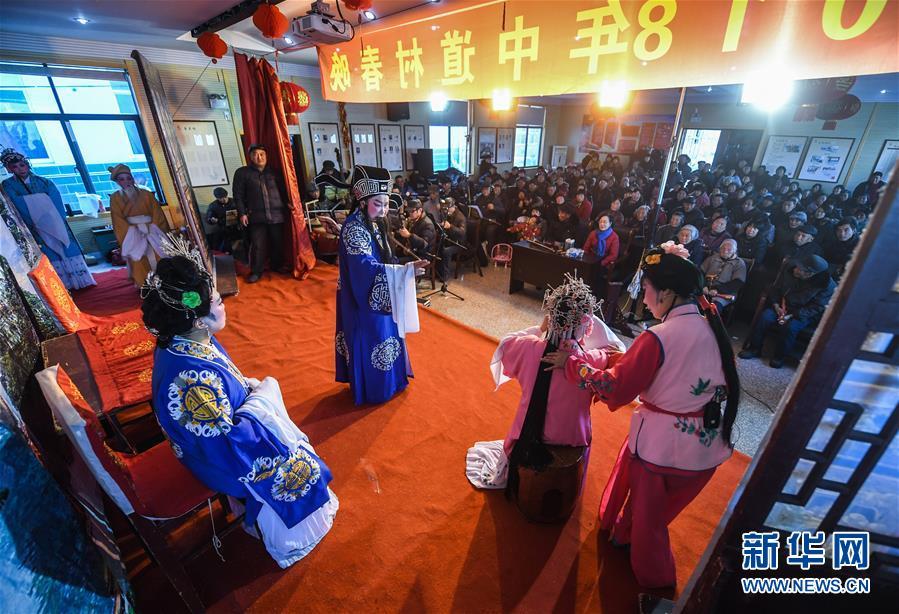 2018年2月6日,長(zhǎng)興風(fēng)華藝術(shù)團(tuán)的演員們?yōu)楹闃蜴?zhèn)中道村的村民們演出越劇。據(jù)了解,長(zhǎng)興縣每年都會(huì)安排100多場(chǎng)“送戲下鄉(xiāng)”活動(dòng),滿足村民的精神文化需求。新華社記者 徐昱 攝