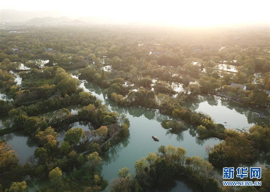 10月29日,游船行駛在西溪濕地河道上(無(wú)人機(jī)拍攝)。新華社記者翁忻旸攝