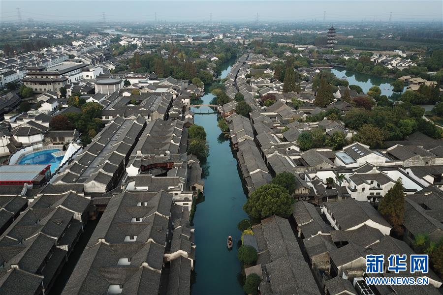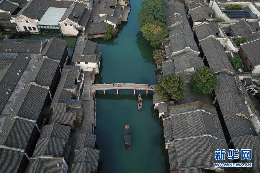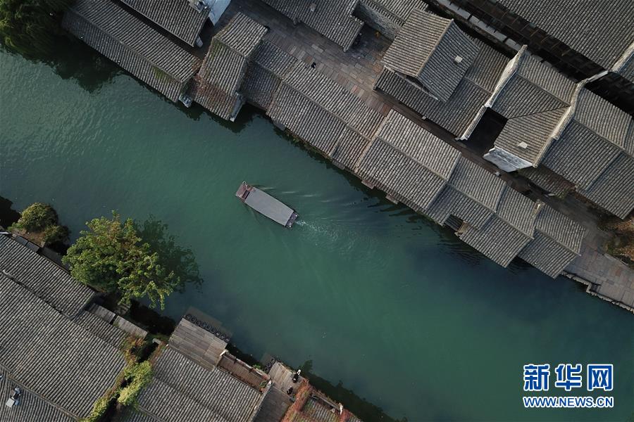 10月18日,游船行駛在烏鎮(zhèn)水道上(無人機(jī)拍攝)。新華社記者翁忻旸攝